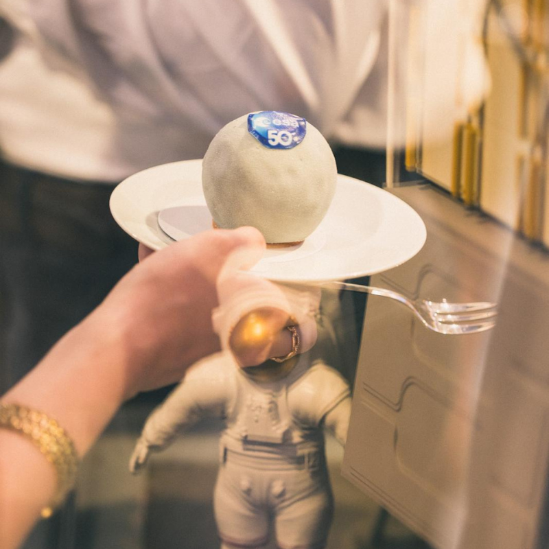 Pour les 50 ans de l’ESA, j’ai orchestré en un temps record une création sucrée d’exception signée Chef Julien Dugourd, champion d’Europe de pâtisserie : une lune gastronomique intégrant le logo de l’agence, alliant esthétique et saveurs mémorables.